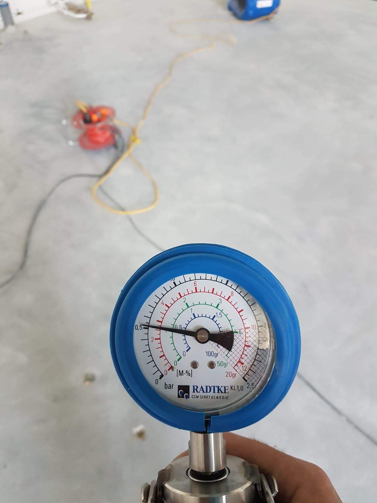 Tijdens het drogen van een betonvloer hebben wij gebruik gemaakt van een carbid meting. Deze meting geeft door middel van een druktest het vochtpercentage in de vloer aan. Calcium carbid zorgt voor een chemische werking in combinatie met vocht. Hierdoor ontstaat gasvorming. Doordat deze chemische werking plaatsvindt in een afgesloten drukfles, kan het vochtpercentage uiterst nauwkeurig en correct worden gemeten.